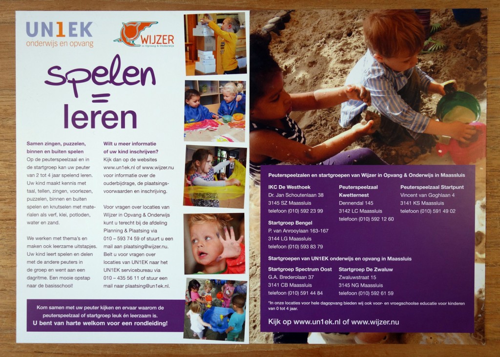 Samen met de communicatiemedewerker van Un1ek - de christelijke organisatie voor onderwijs en opvang in Vlaardingen - heeft Jozet een communicatieplan geschreven voor de introductie van het begrip Integrale Kindcentra naar de (toekomstige) ouders in Vlaardingen en Maassluis. Hieruit kwam naast een aantal persberichten en advertenties in diverse uitgaven onder andere een flyer voort voor de peuterspeelzalen in Maassluis.