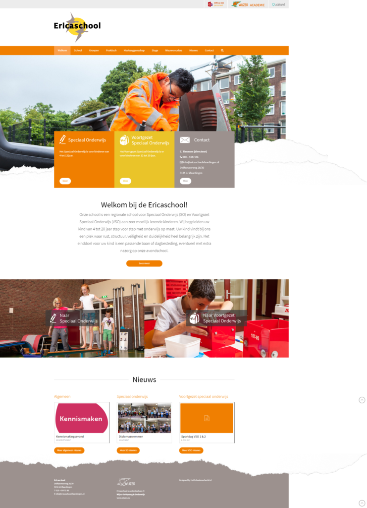 Opdracht: Website Voor de Ericaschool heb ik samen met de werkgroep vanuit school en het reeds geselecteerde bureau voor websitebouw de website vormgegeven. Verder heb ik aansprekende fotografie geregeld en teksten geschreven. Naderhand bleek dat de leerkrachten geen tijd hadden de site te vullen. Dat heeft Jozet ook voor hen gedaan, zodat alles er heel goed en strak uit ziet.